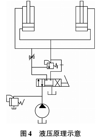 頂升裝置液壓系統比較簡單,頂升執行元件采用2 個小型液壓油缸,采用換向閥及節流閥共同實現對升降的方向及速度的控制;同時,吊臂重量比較大,采用平衡閥防止頂升油缸意外下降,發生危險。 上述設計中液壓系統原理見圖4。 同時為防止油缸內泄等異常情況出現,消除吊臂更換作業的危險性,在頂升裝置托盤4 個角上安裝 4根強度滿足要求的頂升螺紋絲杠進行安全保護。