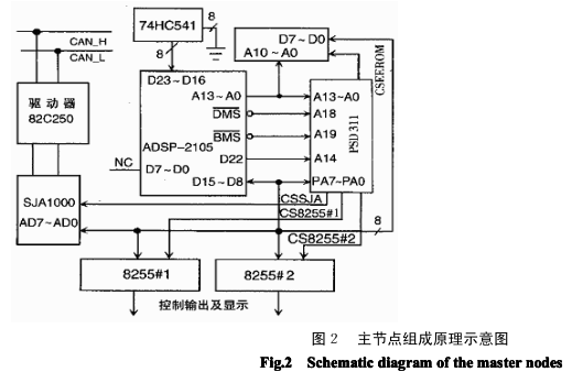 系統(tǒng)主節(jié)點結(jié)構(gòu)原理圖,如圖 2 所示。 中央處理器采用美國模擬器件公司生產(chǎn)的 ADSP2105。它是一種高性價比、性能成熟的 DSP 器件, 在一個 100ns 周期內(nèi),可以完成如下操作:取兩個操作數(shù),修改指向操作數(shù)的地址單元,使兩個操作數(shù)相乘 并將結(jié)果累加到一個 40 位的和中。由于程序循環(huán)在硬件內(nèi)完成,所以每 100ns 能執(zhí)行一次這些高級指令 的操作。WSI 的 PSD311 可編程外圍器件有效地將可編程邏輯、I/O 端口和存儲器集成在一塊芯片上,可 以實現(xiàn)本系統(tǒng)的外圍功能。ADSP2105 在與 PSD311 等外圍器件聯(lián)絡方面提供了很大的時序靈活性。它 可以為 4 個分開的存儲器空間中的每一個單獨分配等待狀態(tài)數(shù)量,以適應很寬的時序差別。我們在 ADSP2105 的 “ 等待寄存器”為 EPROM、RAM 和外部存儲器的選通脈沖安排 1 個等待狀態(tài),即 200ns 周期 時間,以滿足 PSD311 120ns 器件的時序要求。由于總線的通路布在 ADSP2105 的里面,PSD311 的數(shù)據(jù)線 與 D15~D8 連接。ADSP2105 的 “ D22”線提供 PSD311 的 “ A14”地址線,BMS(Boot Memory Select)充當 EPROM 的片選并與 PSD311 的 “ A19”輸入相連接。 選用 SJA1000 作為 CAN 控制器,驅(qū)動器使用 CAN 控制器接口芯片 PCA82C250。EEPROM 用作數(shù)據(jù) RAM,用于保存設(shè)置輸入的關(guān)鍵數(shù)據(jù),以防掉電時丟失。